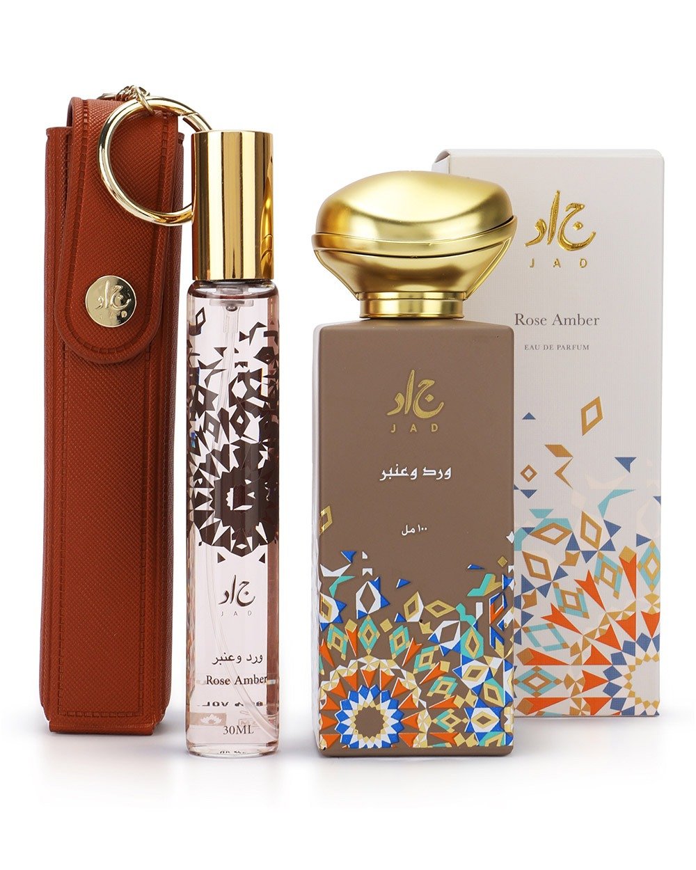 Indulge in the allure of Jad’s Rose & Amber with a complete set designed to elevate every moment. Featuring a 100ml bottle for daily elegance and a 30ml travel-size with its own protective elegant pouch, this collection is perfected with a versatile fabric wrap that adds a stylish twist which you can use it to wrap a gift, tie it to your bag, wear it as a hair accessory, or simply let it become a unique detail that defines your look. No need to think twince do in once and have it all!